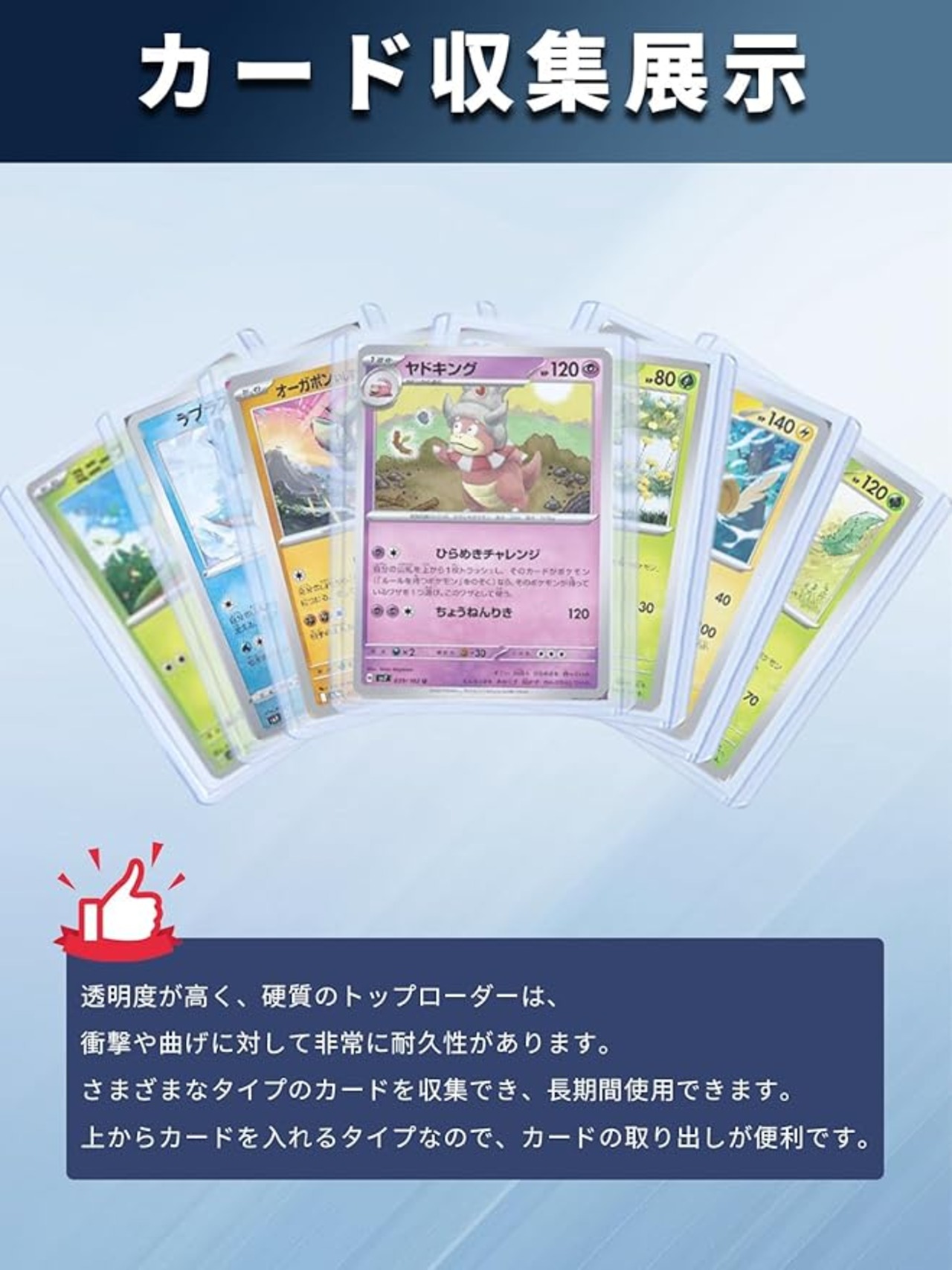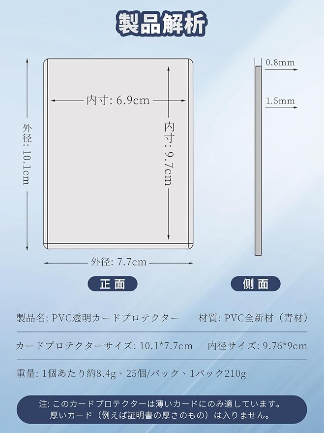 【製品仕様】トップローダーカードケース ×25,カードケースサイズ:10.1×7.7cm,内寸サイズ:9.7×6.9cm,製品素材:高品質の PVC 素材