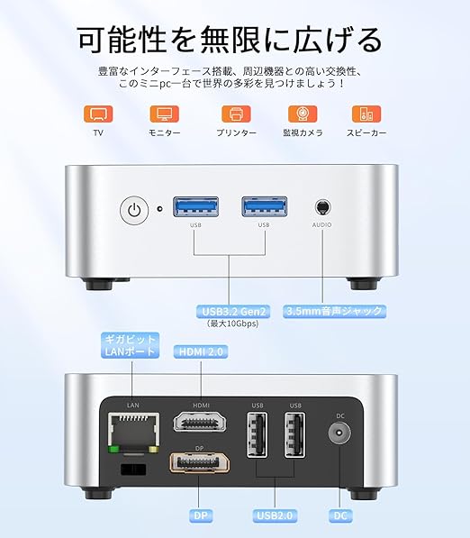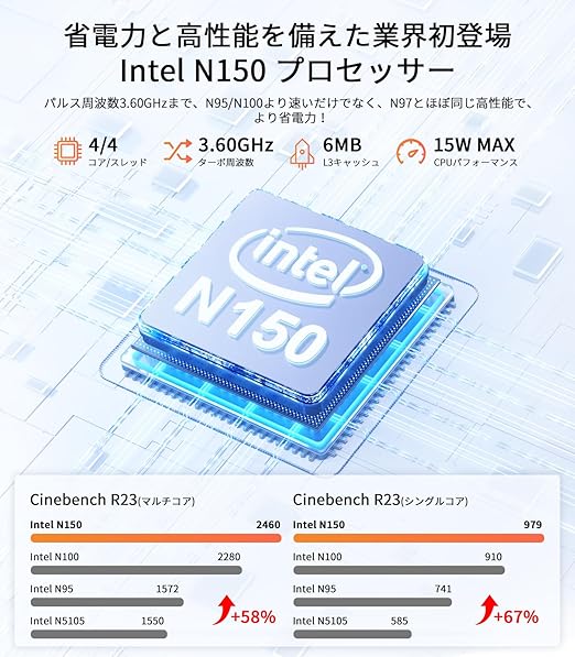 ミニpc インテル n150 mini pc 最大3.60GHz 4C/4T ミニパソコン Windows11 Pro 8GB RAM 256GB SSD容量2TBまで拡大可 HDMI2.0+DP1.4 2画面 4K@60Hz 静音性 高速熱放散 TDP 6W省電力 小型パソコン WiFi 5G/2.4G BT4.2 USB3.2/有線LANポート VESA対応 a