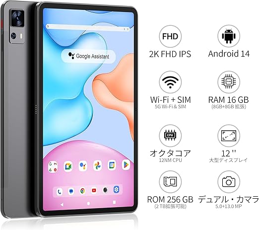 VASOUN TAB 16 12インチ Android14タブレット PC、16GB(8+8GB拡張)+256GB+2TB TF拡張、4G LTE アンドロイド タブレット 2.0GHz 8コアCPU T616、2000*1200 2K IPS画面、8000mAh+18W PD急速充電、13MP/5MP、5G WiFi モデル+顔認識+Youtube視聴用+日本語説明書付属 a