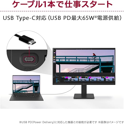【ケーブル1本で簡単接続】 USB Type-C端子 ケーブル1本でデータ転送、映像+音声データ、給電*(USB PD 65W)が同時にできるUSB Type-C端子を搭載しています。 *USB PD(Power Delivery)に対応した機器との接続が必要です。 ※映像視聴の場合は、Alternate mode対応のUSB Type-Cケーブルが必要となります。