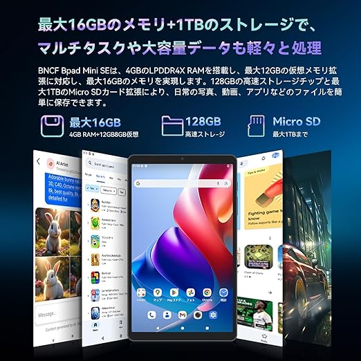 【Android 15 タブレット SIMフリー 】BNCF Bpad Mini SE アンドロイド 15 タブレット 8.7インチ、16GB+128GB+1TB拡張、WidevineL1、8コアCPU T615、8.7" HD IPS 1340x800、4G LTE+GPS+5GWiFi+BT5.0+5500mAh+Type-C、無線投影+画面分割+FM a