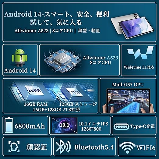 【16GB+128GB+2TB拡張可能&高性能8コアCPU】この10インチWIFIモデルタブレットは16GBのRAMが搭載されており、128GBのROMと最大2TBの拡張機能も備えております。さまざまなビデオ、オーディオ、アニメーション、写真、電子書籍などをダウンロードできます。デュアルスピーカーも装備しており、オーディオを再生すると最高の楽しみが得られます。このandroid タブレットは、A55アーキテクチャを基に設計された新しいA523プロセッサを搭載しています。このプロセッサは4コアに比