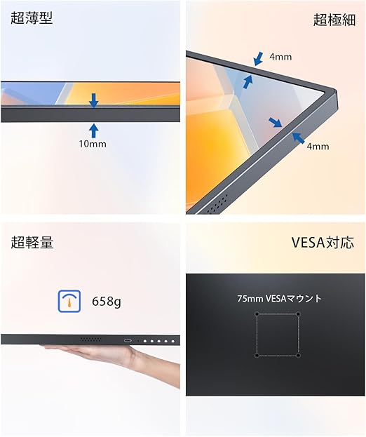 【ケーブル1本だけで接続&スピーカー内蔵】標準HDMI、全機能Type-C二つ、豊富な入力端子をもって多様な接続方法を実現。(市販の90%のデバイスの調査によると、UPERFECT15.6インチモニターは標準HDMI端子が採用されており、他の製品と比べて追加の配線が不要で、接続がより便利なる。)デバイス側はフル機能のTYPC端子があれば、接続する時USB Type-Cケーブル1本で映像出力と電源供給が可能でございます、またType-Cケーブルを経由で接続対応のPC・スマホなどのデバイスに給電も行