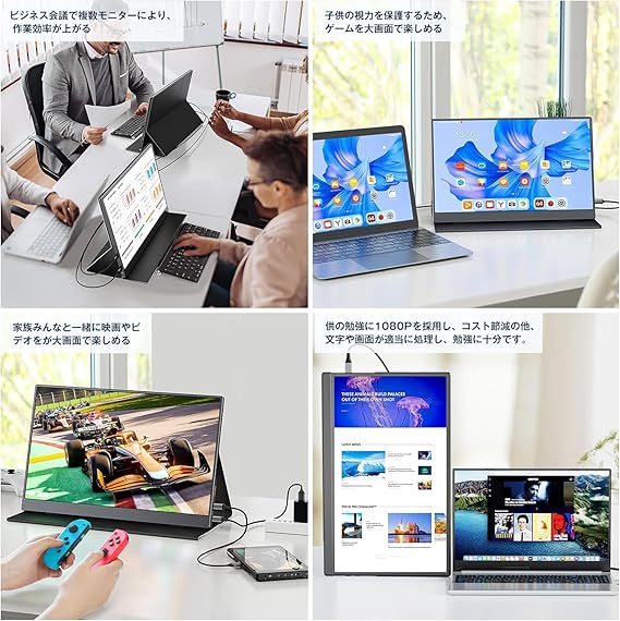 ご注意:一部電源アタプタは捆包のために初期不良可能性があり、点滅や電源入らない場合が、アフターサービスまでご連絡ください。【IPSパネル搭載・フルHDに対応】モバイルモニタは可視性に優れたIPS液晶パネルを採用されるため、 画質・発色が共に高品質なIPSパネルを採用し、屋内外での視認性を確保される。178度の広視野角は、見る位置や角度による歪みや色ずれを最小限に抑え、どの角度から見ても美しい映像をお楽しみいただけます。解像度は1920 X 1080でフルHDに対応でき、HDR(ハイダイナミックレ