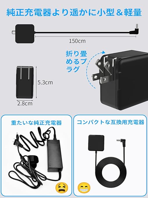 【ケーブルと一体型・小型&軽量・持ち運び便利】このHP 電源アダプターはミニサイズのデザインの上、ACプラグも折り畳める設計のため、小さいに収納できて持ち運び便利です。それに充電ケー