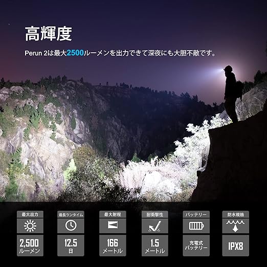 [高輝度]フル充電まで3.5時間ぐらいかかります。Perun2は66時間の実用点灯が可能です。長い航続時間を実現し、最大2500ルーメンの出力を備え、深夜にも大胆不敵です