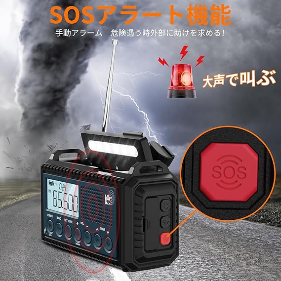 【5000mAh超大容量電池&5つの給電方式、災害などの緊急時に役立ちます】電力を気にしないでください!該当防災ラジオには5つの充電方法があります。ハンドクランク、ソーラーパネル、マイクロUSBケーブル、単4電池(別売)、ACアダプターがバックアップ電源として機能し、防災ラジオをいつでも携帯できるようにします。そしてどこでも!ハンドクランクとソーラーパネルはどちらも、ラジオ、ライト、SOSアラームを必要なときにすぐに使える状態に保つのに十分な電力を再生することができます。充電式電池と単4乾電池3