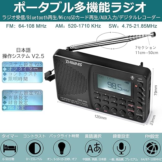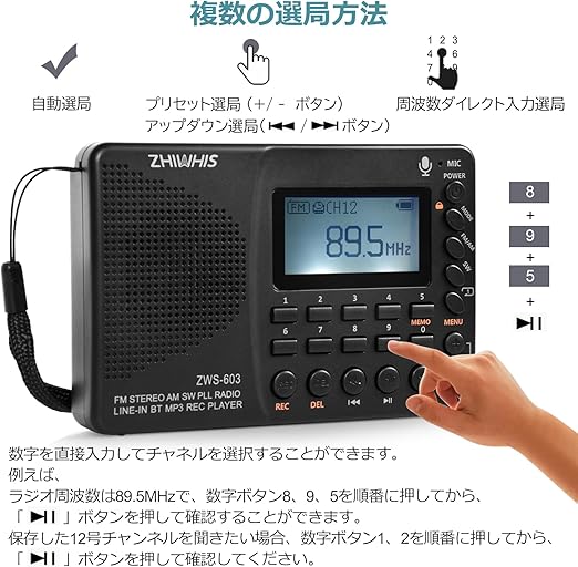 ZHIWHIS ラジオ レコーダー Bluetooth MP3プレーヤー FM/AM/SW/ワイドFM対応 ポータブル多機能 USB-C充電式 スリープタイマー/技適取得済 日本語操作システム MicroSDカード対応 防災アウトドア 新登場ZWS-603 a