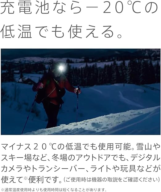【防災アイテム】独自技術により、充電しておけば10年後でも約70%の容量をキープ。充電しておけば、乾電池のように便利に使えます。エネループは防災用にも最適な充電池。寒い場所にも強い。