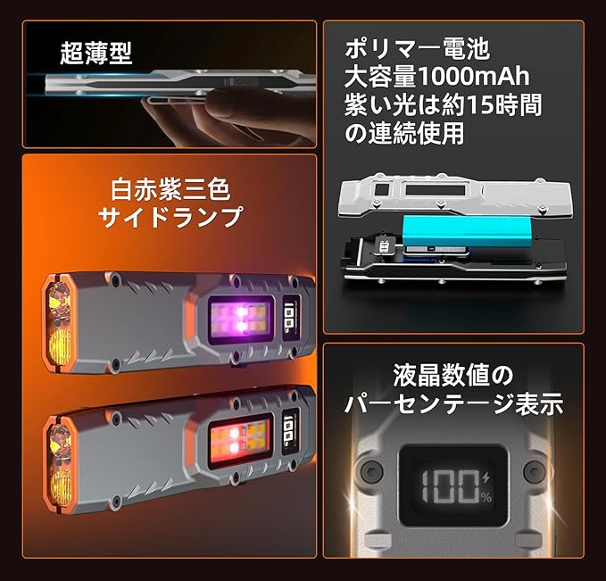 【超軽量超薄型✤多機能超高輝度懐中電灯】重さはわずか102gの軽量化設計を採用し、手のひらサイズでポケットに入れられ、気軽にお使い頂けます。 新たに2つのLED高性能ランプビーズを搭載し、1100ルーメン、白い光照明は超明るく、黄い光の透過力が強く、雨の日の霧の日もまぶしくなく、専門級の高輝度遠射レベルを組み合わせて140メートル照射することができる、防災に最適超遠射ライト;紫い光検査(紙幣検査)偽造印刷物の鑑定、日常的に持ち運ぶのに便利です。超強光束が効果的に照射され、夜を簡単に照らすことがで