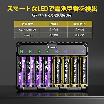 POWXS 電池充電器セット単三電池(2800mAh*8)付き+ 8スロットLED表示 充電器 単三/単四 1.2V ニッケル水素/1.5V リチウム電池を同時充電可能 単3充電器セット a