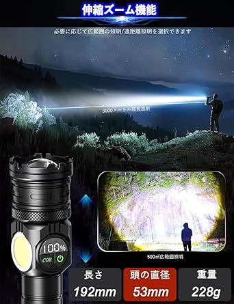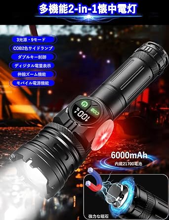 懐中電灯 【2025新登場・3光源9モード・多機能COB】led 強力 軍用 最強 2-in-1キャンプ ランタンライト 5000000ルーメン 超高輝度 明るい ハンディライト ディジタル電気量 ペンライト 防水 新型 Type-C 充電式 フラッシュライト 電池式 ハンドライト 小型 手持ち 作業用 アルミ合金 登山/夜釣り/地震/防災 内蔵21700大容量バッテリ マグネット付き a