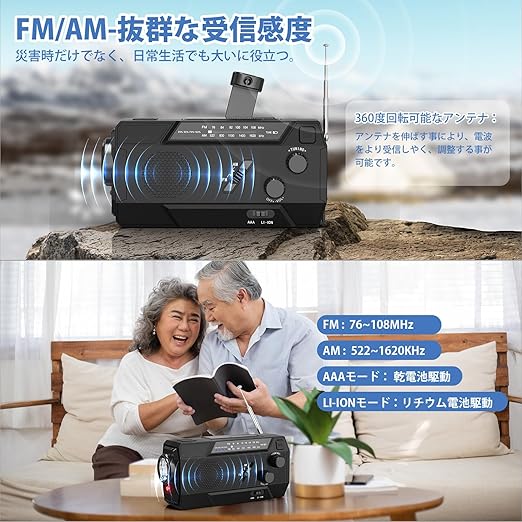 【FM / AM&高感度受信】AM(522-1620kHz)、FM(76-108MHz)の受信周波数に対応した防災ラジオです。普段は普通の家電として使用できる。緊急時には、台風、地震、津波などの貴重な最新情報を受信することができる。また、強化360度回転アンテナを搭載し、優れた受信感度を実現。アンテナを伸ばすことで、より電波の受信・調整がしやすくなります。電波の悪い場所でもしっかり受信できます。防災ラ