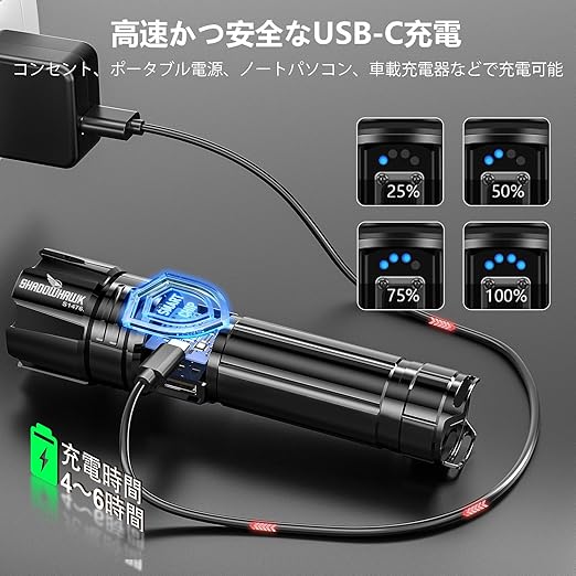 懐中電灯 かいちゅうでんとう led 強力 軍用 最強 Shadowhawk 超高輝度 30000ルーメン フラッシュライト 充電式 ハンディライト XHP70.2 超強力ライト 電池式 ハンドライト flashlight 明るい IP67防水 5モード調光 ズーム調整可能 防災/登山/夜釣り/地震/災害/停電対策/非常灯にも使用可能 (大容量26650充電式電池と3*AAA電池付き) a