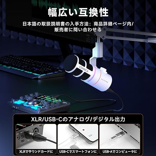 Comica ダイナミックマイク USB/XLRデジタルとアナログデュアル出力 ゲーミングマイク 単一指向性 ブームアーム付き RGBライティング ノイズ軽減 ライブ配信 ゲーム実況 在宅勤務 ポッドキャスト ストリーミング ナレーション録音に最適 PC/PS4/PS5/サウンドカード/オーディオミキサー対応 EJoy D10(白) a