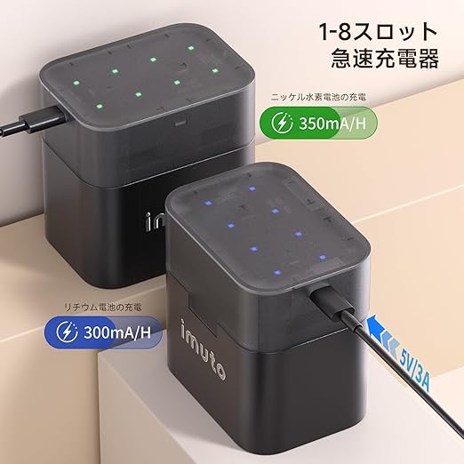 「高効率充電」imuto 単三充電式電池充電器には、8つの独立電源充電スロットがあります。充電式リチウム電池を充電する場合、各スロットは350mA/h