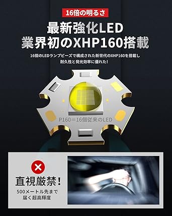 【最新XHP160 超高輝度LED+COB作業灯搭載】新世代のXHP160 LEDライトは使用寿命100,000時間以上に達し、周囲の暗闇を切り開き、夜間であっても昼間のように感じられます。懐中電灯の側面は追加にCOBの白い&赤いライト機能を設計し、緊急停電の時、子供用のデスクライトとして働き、家庭作業の書き込みを行うことができます。コンパクトなサイズで片手で簡単に操作できます。さらにストラップを付属しており、アウトドアなどの場合は手首に引っ掛けて持ち歩くこともできるので大変便利です。