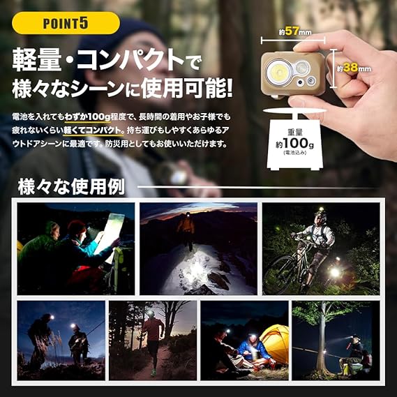 【 小さいのに驚くほど明るい 】白光LEDライトをメインとサブの2個搭載した事で軽量・コンパクトモデルながら明るさは300ルーメン。左右のライトから光を照らすワイドビームでLEDランタンとしても使えるほど広範囲を明るく照らします。LEDチップは安心の米国CREE社製を使用。照射距離は72mと十分遠くまで明かりを確保できるので釣りや登山はもちろん停電など災害時にも安心のLEDヘッドライトです。明るさは10lm/90lm/100lm/235lm/300lmと5段階の調整が可能で環境に応じてお好みの明