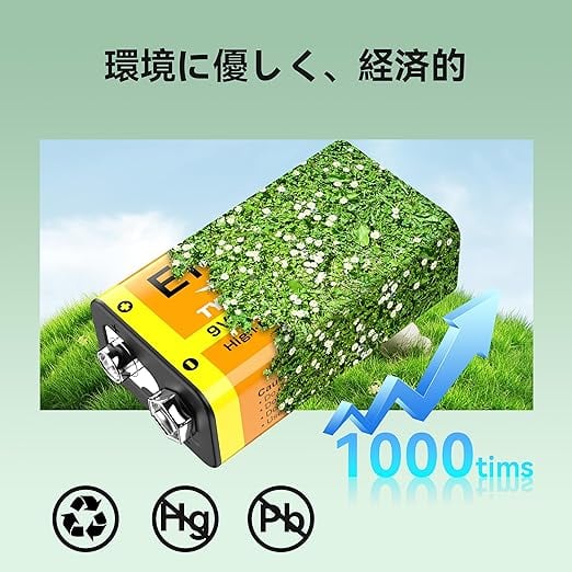 【大容量&パワフルな性能】 ENEGONの最新9V充電式電池は、1100mAh/9.9Whの大容量を誇り、一般的なアルカリ電池の2倍、NiMH電池の3倍のパワーを提供します。エレキギターやモーターなどの高消費電力デバイスに対応し、安定した長時間のパフォーマンスを実現。さらに、500回以上の充電が可能で、コスト削減にも貢献します。