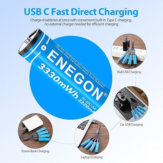 ENEGON 単三電池 充電式 4本セット 3330mWh (2220mAh)1200回以上使用可能 1.5V定出力 単3 リチウムイオン電池 - TYPE-C充電ケーブル付き 保護回路付き a