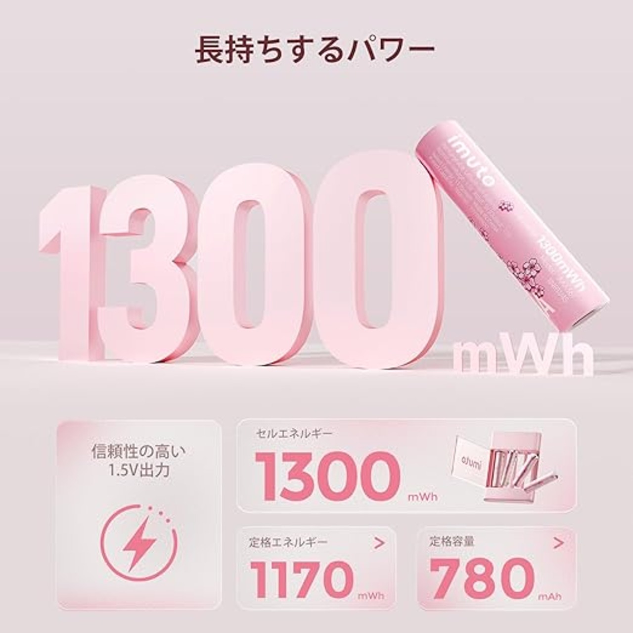 「単四リチウム充電電池」imuto 単4電池(1300mWh*4)大容量のリチウムイオン充電池は、超長待機時間で、充電して数回繰り返し使えます。電気代を節約でき、環境にも優しいです。デバイスを最適な状態に保ちます。安全保護機能が搭載されているため、充電中の安全性について心配する必要はありません。