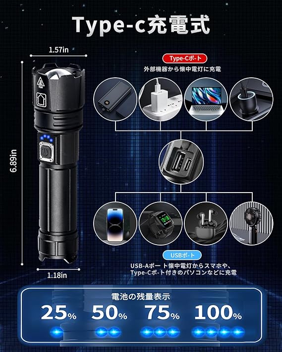 懐中電灯 強力【2025超高輝度XHP160チップ】かいちゆ電灯 5000mAh 強力 充電式/電池式 単4電池適用 26650付き ハンディライト フラッシュライト 軍用 最強 IPX7防水 防災 5モード調光 ズーム式 残量表示 登山 夜釣り 作業用 停電 避難対策 a