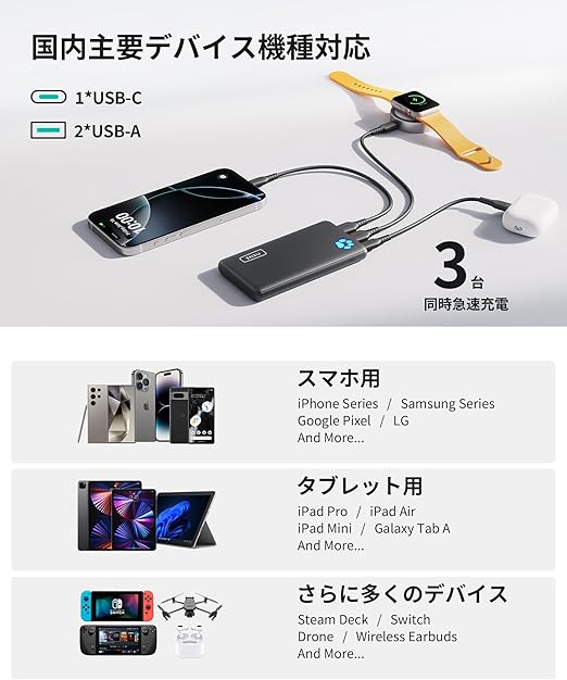 INIU B41 モバイルバッテリー 10000mAh 大容量 軽量 小型 3台同時充電【USB-C 入出力×1 & USB-A 出力×2 PSE認証済】モバイル・バッテリー ポータブル 薄型 アウトドア/災害/緊急用の便利グッズ iPhone 16 / 15 & Android iPad その他各種対応 日本語取扱説明書付き【ブラック】 a