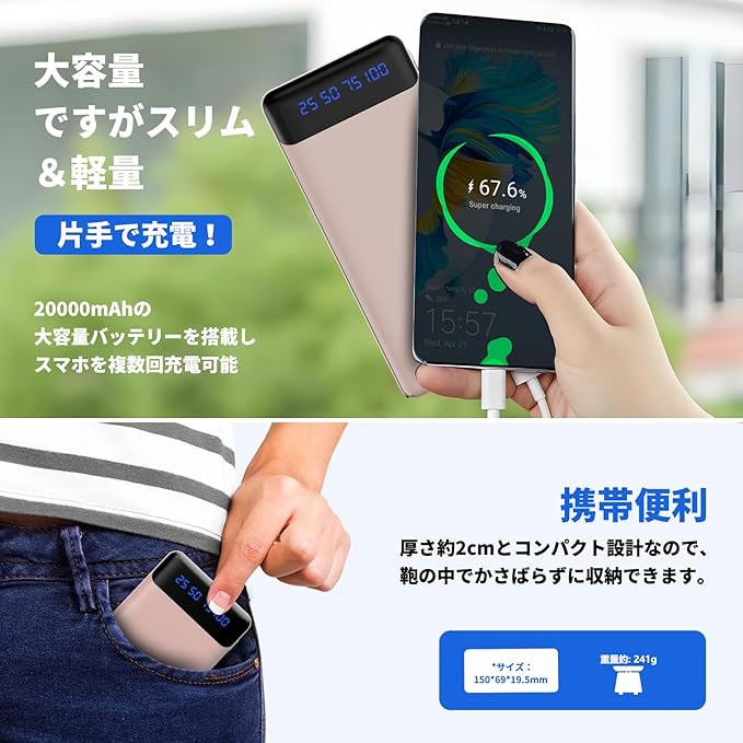 20000mAh大容量:20000mAHの大容量モバイルバッテリーでiPhone 14 に約3.5回、Huawei P40に3回以上、その他ほとんどのスマートフォンに複数回の充電可能です。 スマホはもちろん、モバイルWi-Fiルーター、携帯ゲーム機まで幅広く高速充電できるため、日頃の使用だけでなく、台風、地震など災害時の非常用電源としても、空調作業服用バッテリー、電熱ベスト用バッテリーとしても適しており、電池切れの心配はありません。