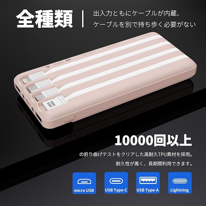 EEIVOL モバイルバッテリー 20000mAh 軽量 小型 大容量 4本ケーブル内蔵 5台同時充電 携帯バッテリー スマホ充電器 LCD残量表示 持ち運び便利 携帯充電器 iOS/Android 全機種対応 スマホ 充電器 コンパクト パワーバンク アウトドア 防災 緊急用 停電対策 機内持込可能 PSE認証済 (ピンク) a
