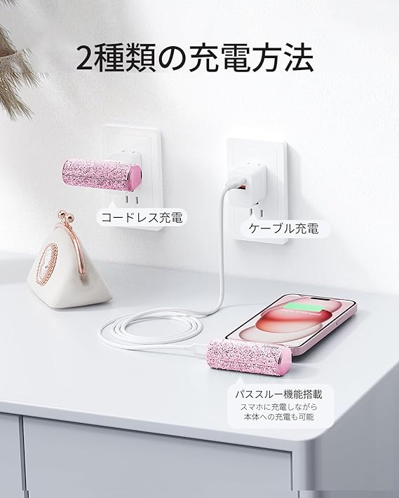iWALK モバイルバッテリー 超小型 軽量 きらめくかわいいモバイル充電器 USB Type-C 直接充電 コネクター内蔵 コードレス 4500mAh コンパクト おしゃれ iPhone15/16シリーズ iPad AirPods Android対応 ギフト プレゼントとしてもぴったり PSE認証済 ピンク a