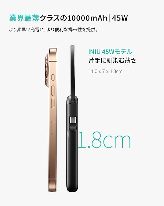 INIU P41L 超軽量 モバイルバッテリー 小型 45W急速充電 USB-C USB-A 10000mAh 内蔵ケーブル付き 3台同時充電 PSE技術基準適合 大容量 安全設計&多種保護 携帯充電器 薄型 旅行/出張/停電対策/アウトドア/災害/緊急用の便利グッズ iPhone 16 / 15 & Android iPad その他各種対応 日本語取扱説明書付き【ブラック】 a