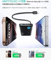 【45Wフルスピード充電 – 最新iPhone 16 & Galaxy S24対応】最大45Wの出力でPD、QCなどの高速充電プロトコルに対応。わずか25分でiPhone 16を63%、Galaxy S24 Ultraを驚異の73%まで充電可能です。