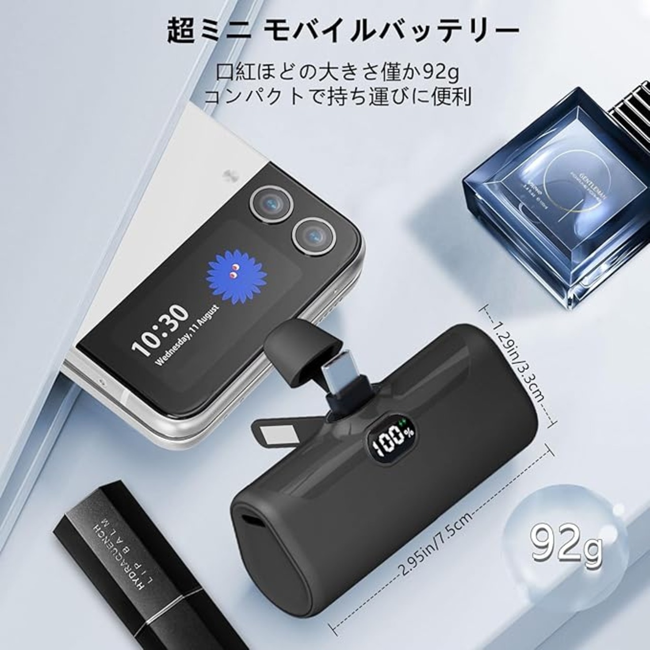 LUCKYDUO モバイルバッテリー 軽量 小型 5000mAh Type-Cコネクター内蔵 コードレス コンパクト 直接充電 急速充電 LCD残量表示 LEDライト&スマホホルダー付き Android用iPhone16/15/Xperia/Galaxy/Pixel/HUAWEI/ゲーム機など充電対応 PSE認証済(ブラック) a