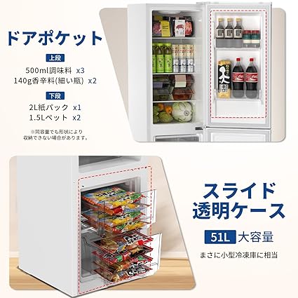 【165Lの大容量収納】総容量165L(冷蔵室114L/冷凍室51L)で、ふたり暮らしや小家族にぴったりなサイズで、2~3人分の食材を余裕を持って収納可能。 ●可動式の