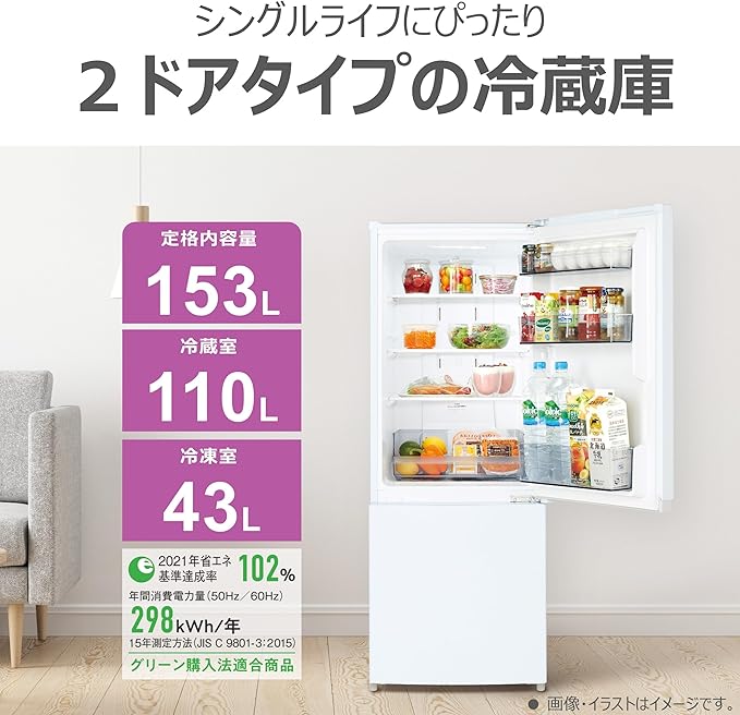 【定格内容積】153L(冷蔵室:110L〈90L 〉冷凍室:43L〈29L〉)※〈〉内は食品収納スペースの目安