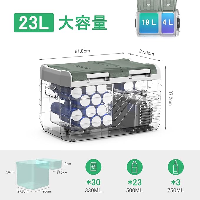 【大容量車用冷蔵庫】23Lの大容量で330ml缶が30本、500mlのペットボトルが23本、750mlのビンが3本を収納