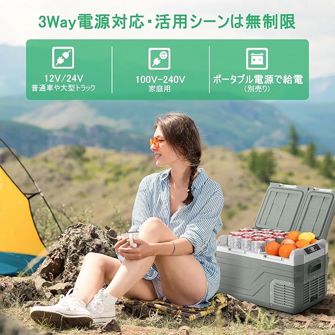 【2室独立温度制御】車載 冷蔵庫は左右に分かれた二室を、別々の温度に設定できることです。それにより、冷凍品と冷蔵品をこれ一つで同時に収納できます。例えば、左室は6℃で食材や飲み物を冷蔵し、右室は₋20℃で冷凍食品や氷を冷凍しておけます。冷凍と冷蔵が庫内で仕切られているため、各食材に合わせた温度を保つことができ、遠くのキャンプ場に出かけた際でも新鮮な食材を味わうことができます。