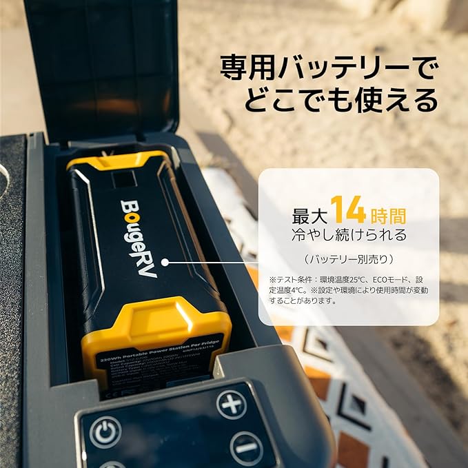 【バッテリー駆動でどこでも使える】BougeRV CR Pro 29L車載冷蔵庫は、別売りの220Wh専用バッテリーを内蔵することができます。このバッテリーにより、車のエンジンを停止した状態や電源がない場所でも冷蔵庫を最大14時間稼働させる