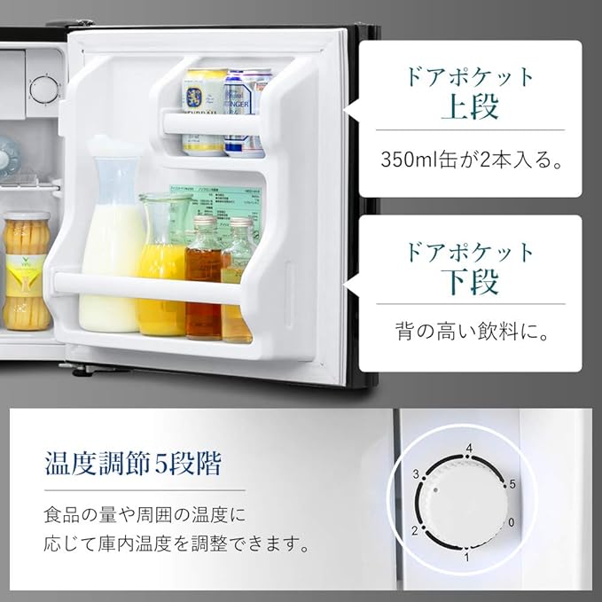 種類:ノンフロン冷蔵庫 商品サイズ(cm):幅約47.5×奥行約45.5×高さ約50、商品重量:約18kg 定格消費電力/50Hz:58W、60Hz:60W 定格内容積:42L 電源コード長さ:約1.8m