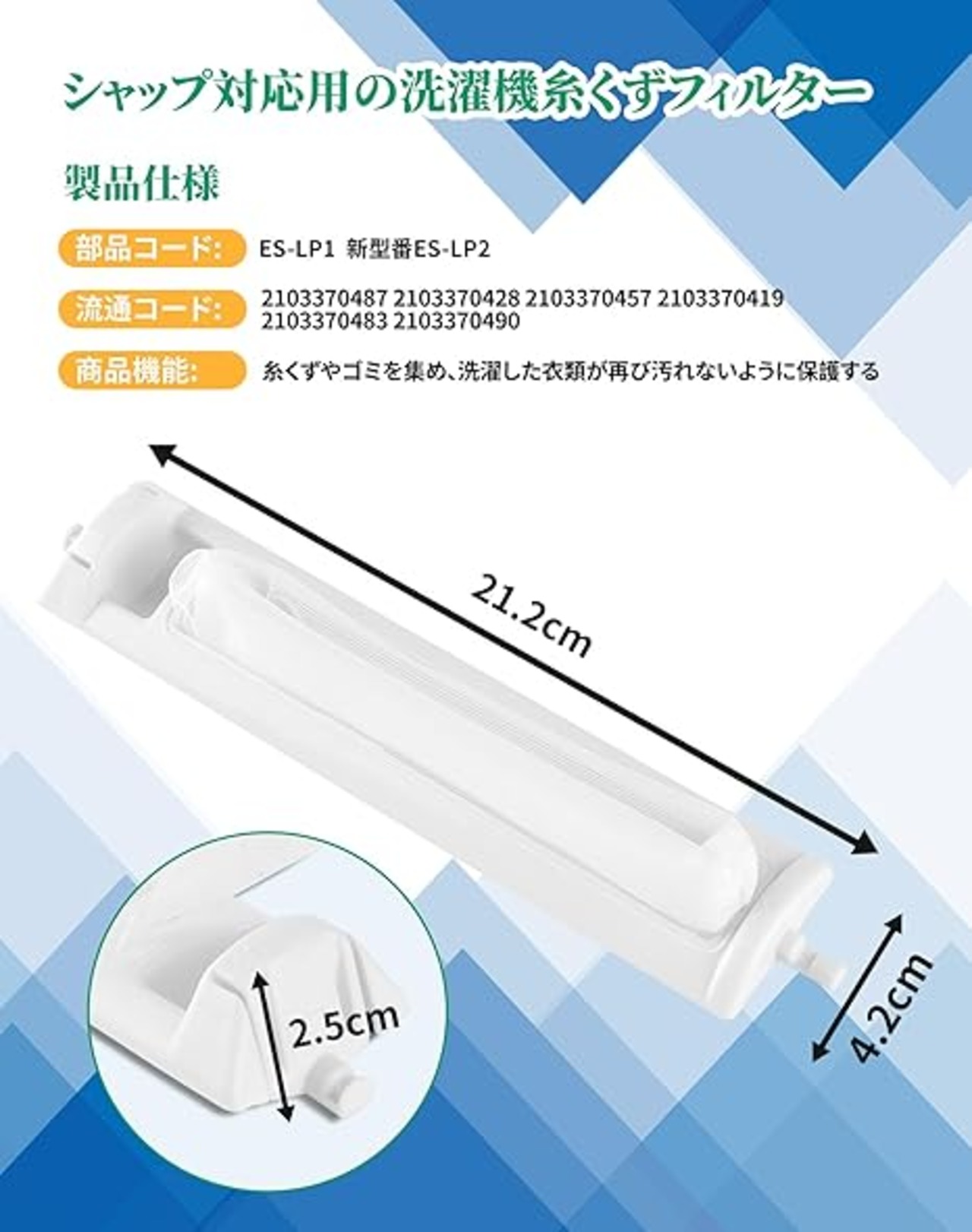 ES-LP1 ES-LP2 シャープ洗濯機用糸くずフィルターです。流通コード:210-337-0487、210-337-0428、210-337-0457、210-337-0419 、210-337-0483、210-337-0490 入り数:5個入り サイズ:約21.2×4.2×2.46cm ※ご自宅の洗濯機内のフィルターの寸法と形状を十分ご確認した上でご購入して下さい。