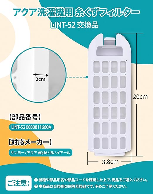 【商品仕様】アクア洗濯機対応の糸くずフィルターで、部品コード: LINT-52、対応メーカー: アクア用(AQUA) サンヨー 、流通コード:0030811660A(色違いの場合有ります)、材質:ABSプラスチック+ポリエステルメッシュ、ご購入の際は、本製品はLINT-52 糸くずフィルター アクア用の同等品ですが、造り構造は、洗濯機購入時の純正品と比較して、明らかにシンプル、省略的です。