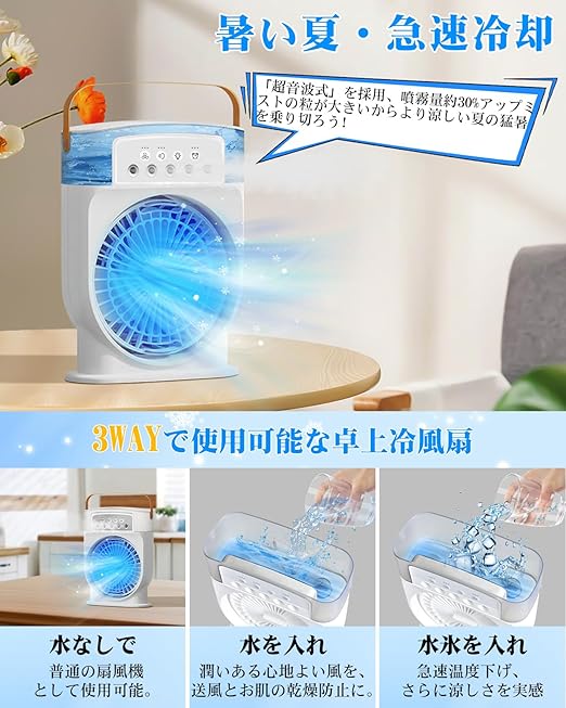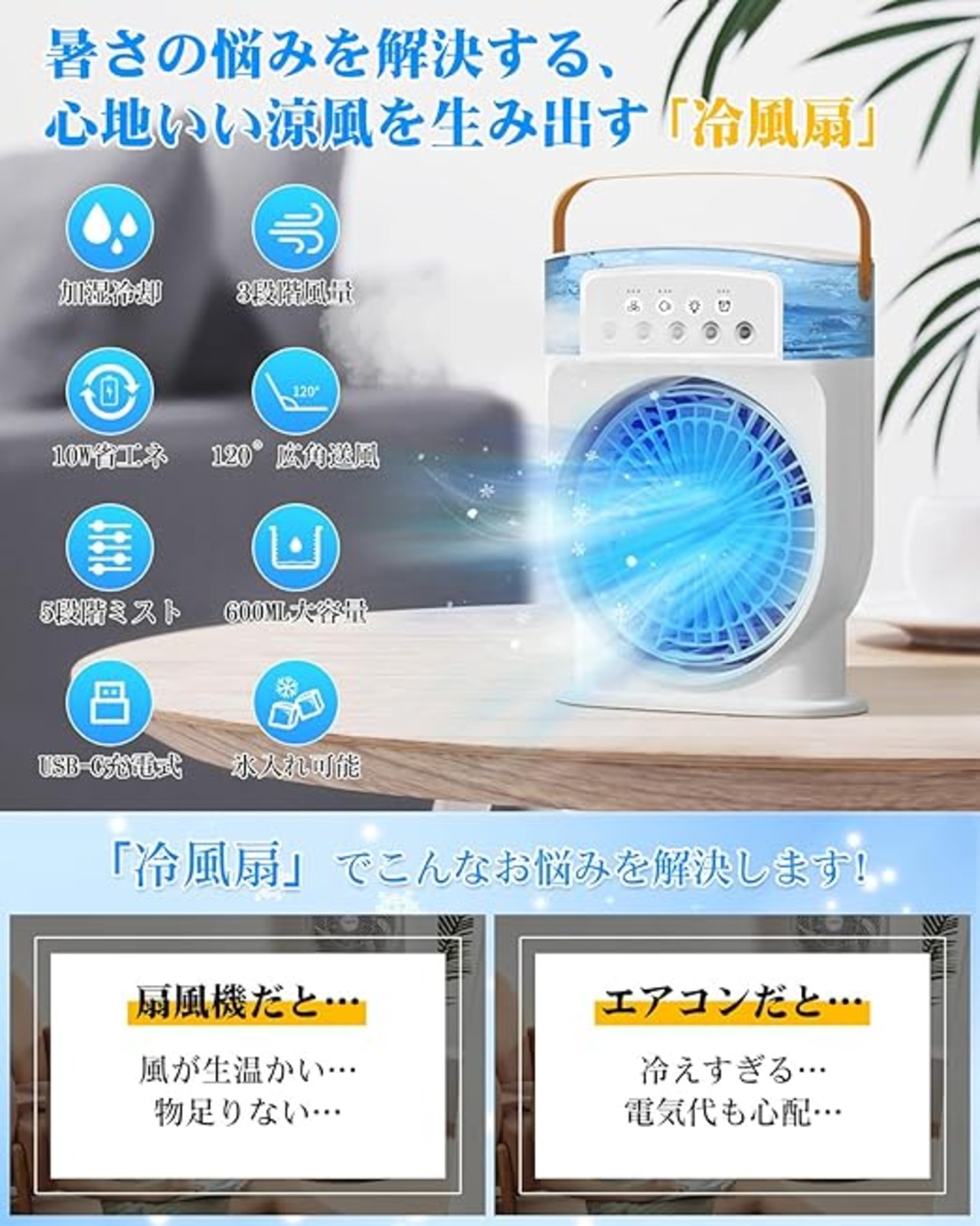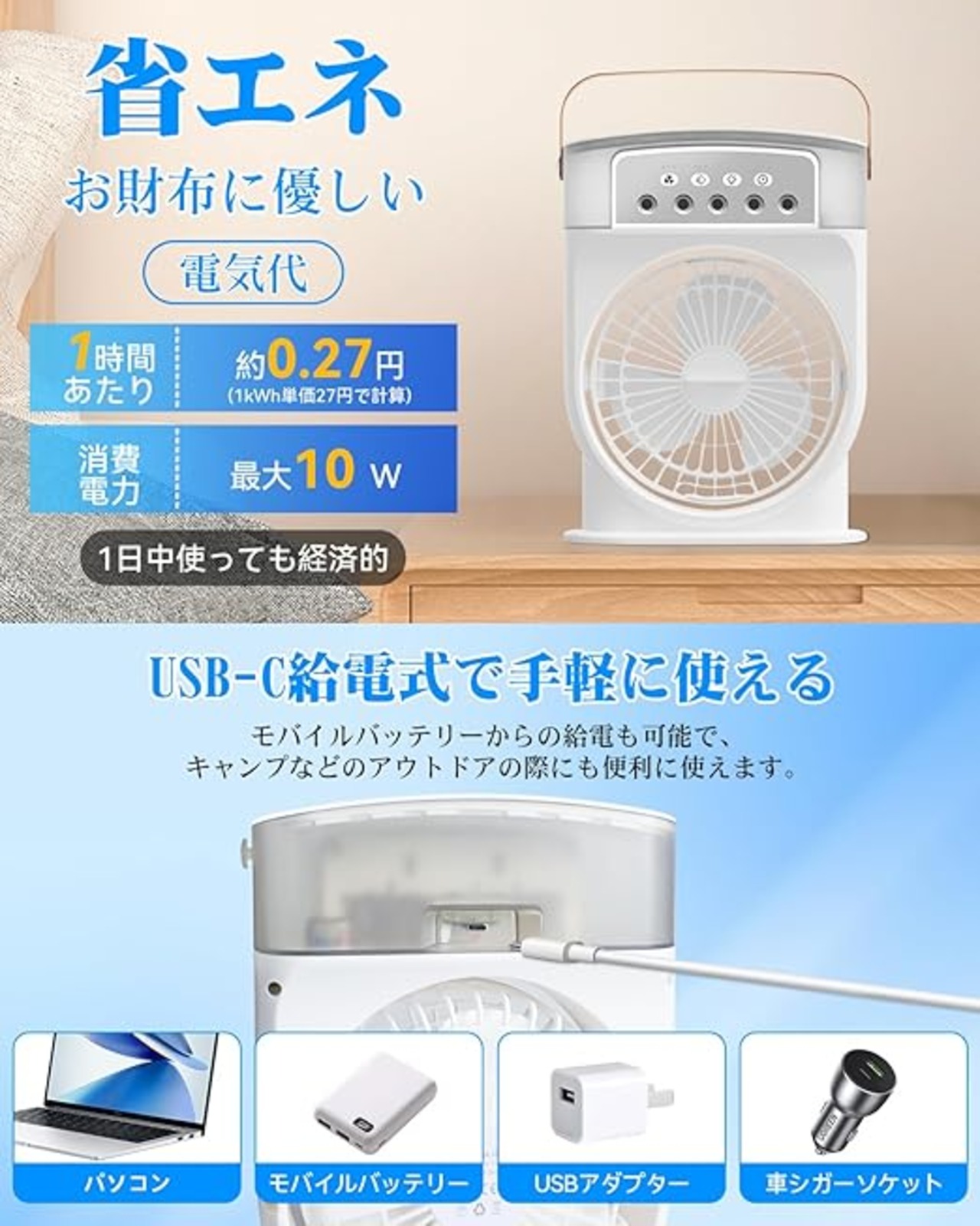 【使いやすいUSB-C充電式・10WMAX省エネ・節電対策】弊社の卓上冷風扇はUSB-C充電式なので、パソコンやモバイルバッテリーなどからの充電に対応して、コンセントが近くにない場所でも使用できて、キャンプなどのアウトドアの際にも便利に使えます。水の力で冷やす冷風機、最大出力はわずか10Wで、1時間当たりの電気料金はたったの約0.27円、1日8時間使っても、1カ月の電気代はわずか約64.8円とかなりの省エネ仕様なので、蒸し暑い時期の電気代を節約することができます。