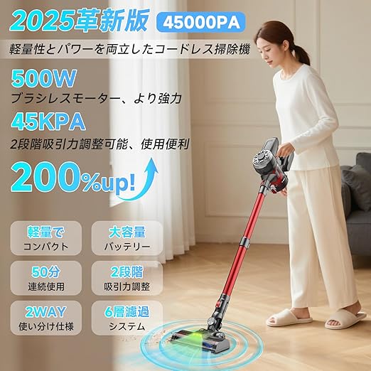 Hearten 掃除機 コードレス【2025超軽量設計・グリーンLEDライト搭載】コードレス掃除機 45000pa 強力吸引 2段吸引力モード 低騒音 スティッククリーナー 50分連続稼働 着脱式バッテリー付き ハンディクリーナー 伸縮パイプ サイクロン 6重濾過システム 1.2L集塵 スティックそうじき ワンタッチゴミ捨て ハードフロア/カーペット/カーテン/ソファ/車用 PSE認証済 a