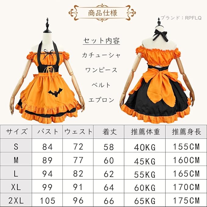 [RPFLQ] メイド服 コウモリ コスプレ ハロウィン 仮装 オレンジ 衣装 レディース ロリータ フリル 衣装 蝶結ぶ 背中空き 可愛い 大人用 舞台衣装 演出服 カチューシャ エプロン 4点セット