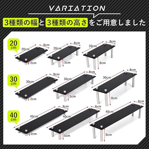 サイズバリエーション:幅20cm・30cm・40cm、高さ2cm・5cm・8cmの全9タイプ