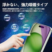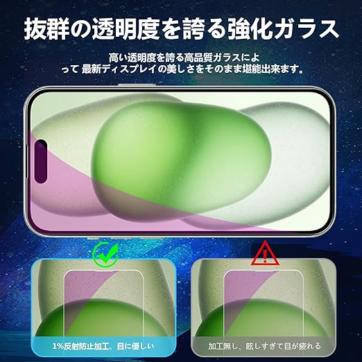 【対応機種 iPhone 15 専用 6.1インチ】iphone15 ガラスフィルム。 アイフォン15 保護フィルムに独自で設計・開発。透明・保護のデザインをとり、保護性と耐衝撃性を備え同時に、高級のガラスを選択し、99%透過率を実現しました。透き通ったガラスフィルムに多層フィルタフィルムを採用し、素晴らしい透明度を確保して、一体感になって、まるで貼っていないみないような感覚で美しさはそのままにお楽しみいただけます。