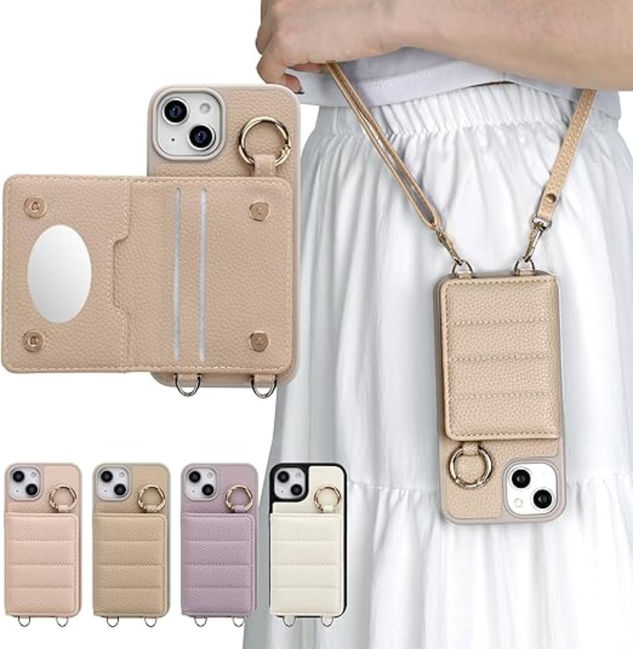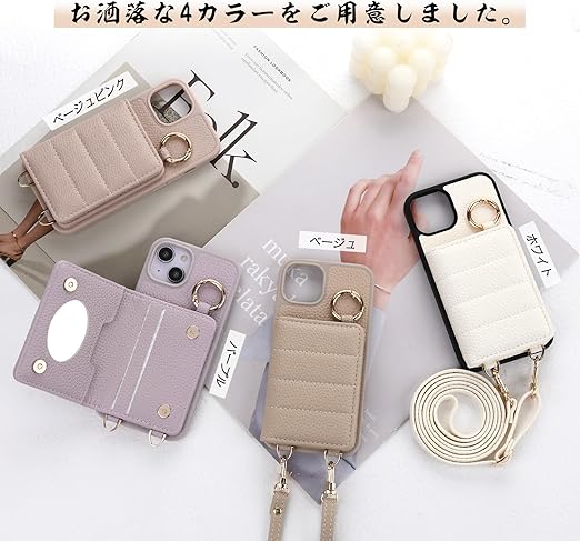iphone 15 手帳型ケース ショルダーストラップ アイフォン15 スマホケースミラー付き あいふぉん15 携帯ケース 肩掛け 斜めかけ リング付き アイホン15 携帯カバー 化粧鏡付き 背面 カード収納 PUレザー アイフォン15 ケース おしゃれ 軽量 擦り傷防止 携帯ケースiphone 15 保護ケース 全面保護(iphone 15(6.1")ベージュ) a