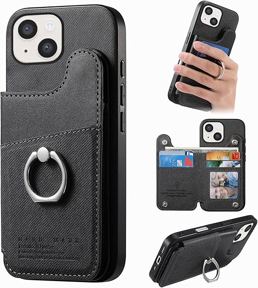 For iPhone 14 / iPhone 13 ケース 手帳型 リング付き アイフォン 13 / 14 スマホケース iphone 14 ケース 耐衝撃 背面 カード収納 あいふおん14ケース いphone14 カバー PUレザー 薄型 いphone13 スマホカバー 財布付き カメラ保護 スタンド機能 RFIDブロッキング 360°回転 スナップボタン TPU 軽量 おしゃれ ブラック a