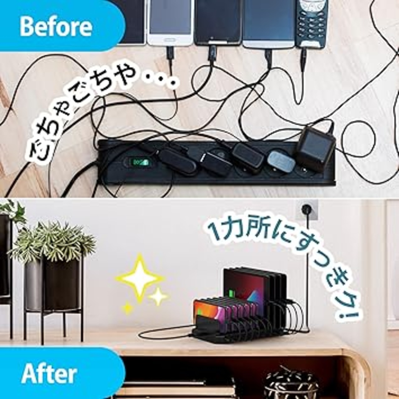 【10台同時充電タイプ】付属の仕切り板(高い板5枚+低い板6枚)で最大10台のモバイル機器をキレイに置けます。スマートIC内蔵で充電中、USBデバイス端末に適した最適な電圧を自動的に調整できます。iPadなら最大で8台まで充電できます。