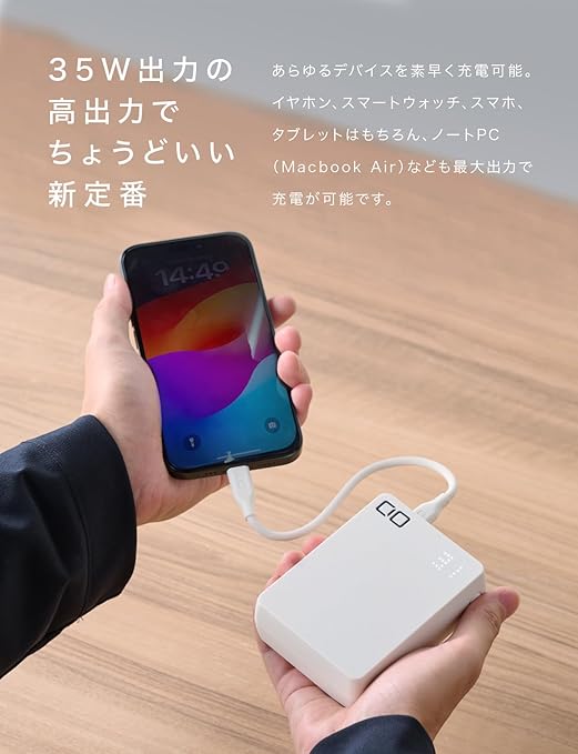 【毎日使える安心のモバイルバッテリー】20000mAhは大きくて重い。そんな常識を覆す程、コンパクトで軽量なモバイルバッテリー。従来の20000mAhモバイルバッテリーと比較し、約3分の2の体積を実現(CIO製品との比較)。コンパクトなフォルムにもかかわらず、iPhone15なら約3.5回、Galaxy S24なら約3.0回。あらゆるデバイスを複数回充電可能です。毎日のお出かけに、旅行に大活躍します。